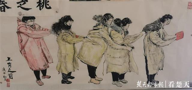 “我在居委会的微信群里看到了这张照片,那时候整个武汉市的物资都非常紧张,我们的社区工作人员没有正规的防护服。这幅画里最左边的是二居委会贾芳书记,她穿的是自已买的雨衣,其它同事都穿的简易版超薄‘防护服’”,黄世礼介绍到,“社区工作人员、下沉干部还有志愿者们每天冒着危险,不怕牺牲为大家服务,我想通过这些画,为我们社区的英雄们点赞,他们非常了不起!”
