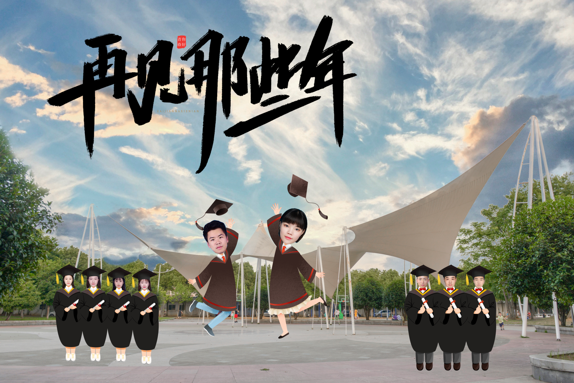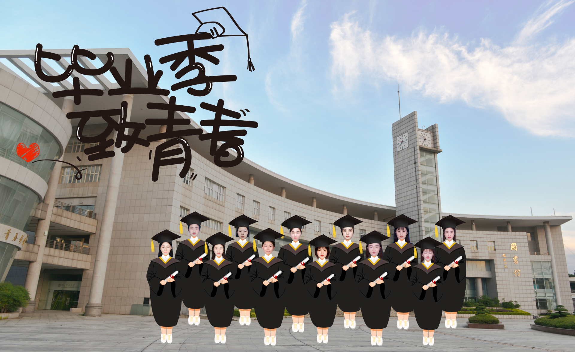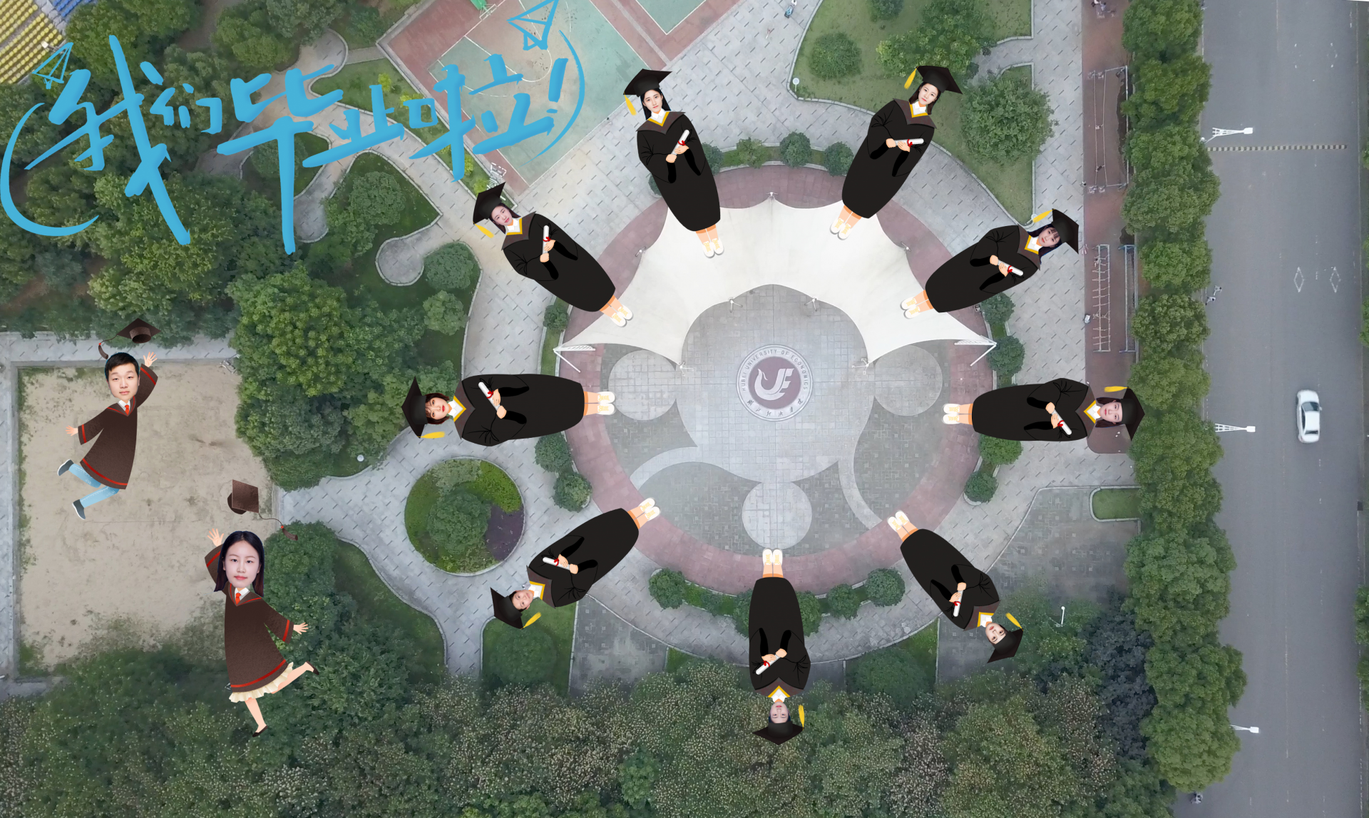 这套毕业照的最大亮点是大学生们的大头照和手绘式学士服。疫情期间,学生们不能返校,法商学院组织宣传部提供最新校园图片,该校金融系毕业生杨晨风设计,各班实习小组长收集了同学们的登记照,通过“云”上,在校园“小光谷”“西区田径场”“图书馆”“逸夫教学楼”等标志性位置进行毕业合影。
