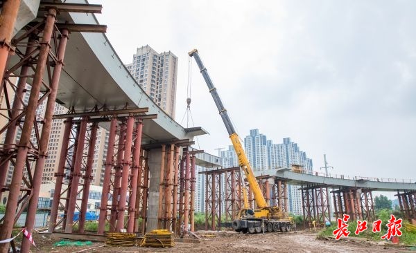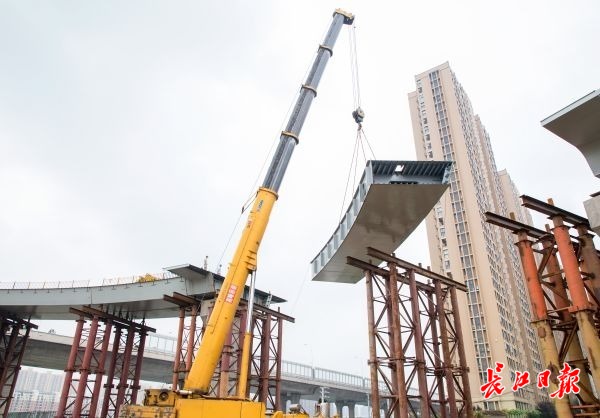 施工方中国一冶钢构公司项目负责人介绍,本次合龙的杨泗港快速通道青菱段一匝道,主要为往北到武昌火车站、武昌中心城区以及向南到白沙洲大道方向的车辆服务,匝道呈“C”字形布置,总长度202.5米,桥宽14.7米,钢结构重量约为1600吨。