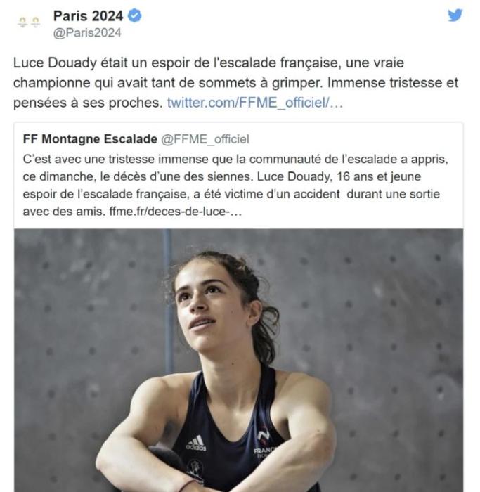 巴黎奥组委也在官方社交媒体上发布了一张杜亚迪的照片,并配文道:“一位有前途的法国攀岩高手,一位真正的冠军,还有很多山峰等着她攀登。”