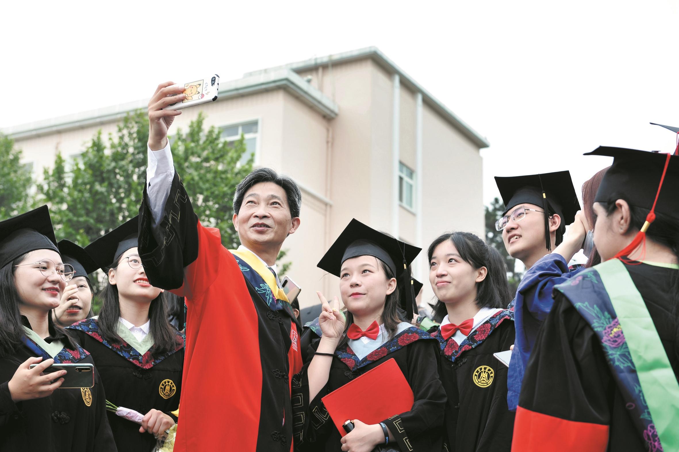 在毕业典礼上,学校连续三年为即将奔赴祖国各地的毕业生送上“毕业鼓励”。该校82岁高龄的中国工程院院士傅廷栋真情寄语:“努力学习、刻苦专研,为国家科学事业做贡献!”