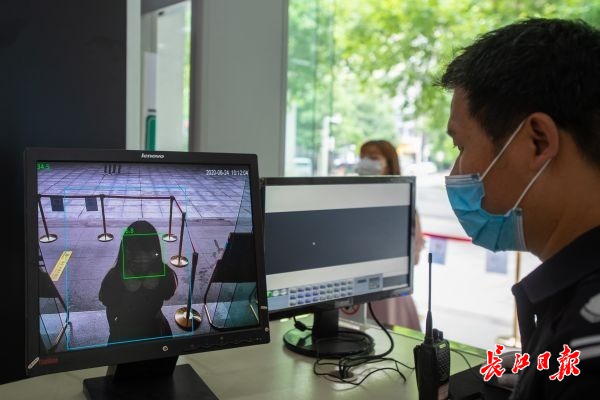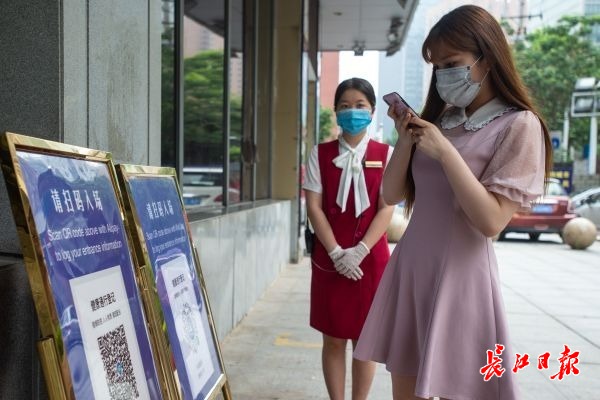 扫码、测温,已成为武汉人进入公共场合的习惯动作。记者在中南剧场门前看到,入口被安排在右侧的横向通道,沿途贴满了健康码扫描提示,地面贴有一米线。经过扫码,观众到达入口处时,原有的两台安检仪被缩减为一台,并在安检门后安装了自动测温门,观众可一步完成安检及测温,不需要过多停留。