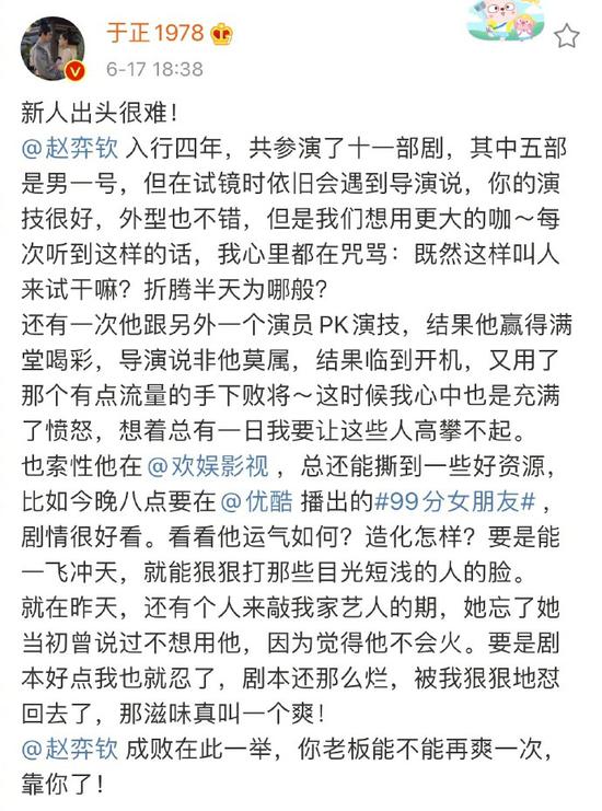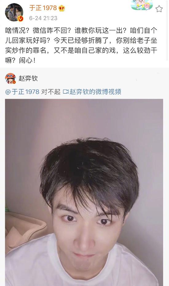 网易娱乐6月25日报道 上周,于正旗下艺人赵弈钦主演的新剧开播,于正特地发微博宣传,表示剧情很好看,希望赵弈钦可以一飞冲天狠狠打那些当初不看好他的人的脸。他喊话赵弈钦:“成败在此一举,你老板能不能再爽一次,靠你了!”24日晚,赵弈钦发视频向老板于正道歉,表示新剧收视不如预期,于是直接自泼三杯水谢罪。于正则在微博劝对方别较劲:“别给老子担上炒作的罪名。”