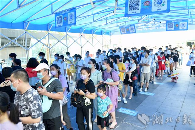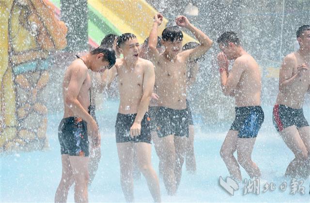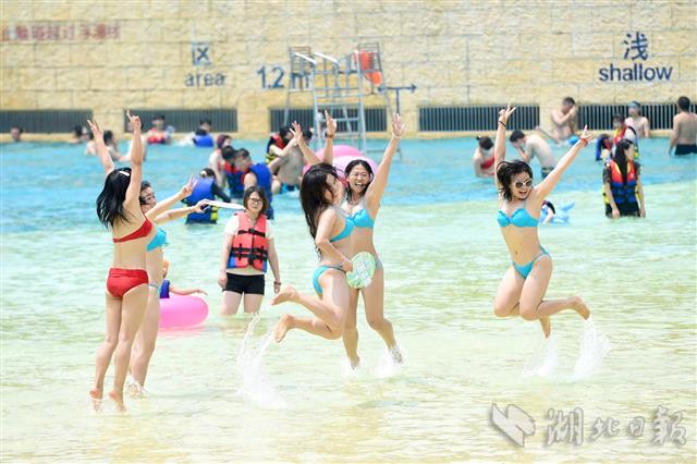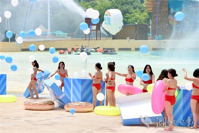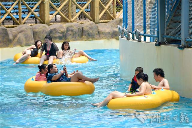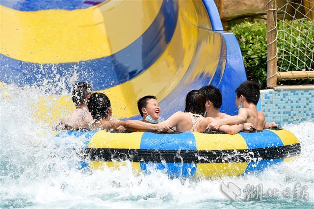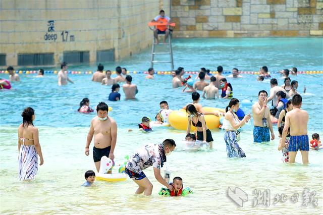 2020年6月25日,武汉玛雅海滩水公园欢乐开园,首批市民游客经网上预约、核验健康码、测量体温后入园下水体验。据了解,园区用水每两小时循环消杀一次,游客总量控制在最大承载量的30%以内。园方开园前已对所有设施和公共区域进行全面消杀,开园后每天还将定时进行消杀。(湖北日报全媒记者 李溪 摄)