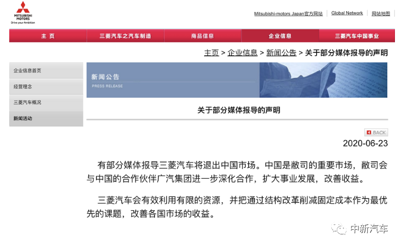 6月23日,三菱汽车在其官方网站发表声明进行辟谣:中国是三菱汽车的重要市场,三菱汽车会与中国的合作伙伴广汽集团进一步深化合作,扩大事业发展,改善收益。三菱汽车会有效利用有限的资源,并通过结构改革削减固定成本作为最优先的课题,改善各国市场的收益。