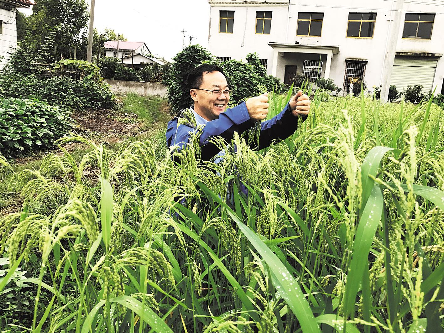 张启发院士在鄂州“双水双绿”水稻品种选育基地察看水稻生长。(图片由华中农业大学双水双绿研究院提供)