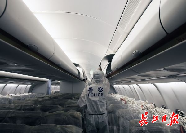 武汉边检民警登上货运客机进行边防检查程序。通讯员邵爽 供图