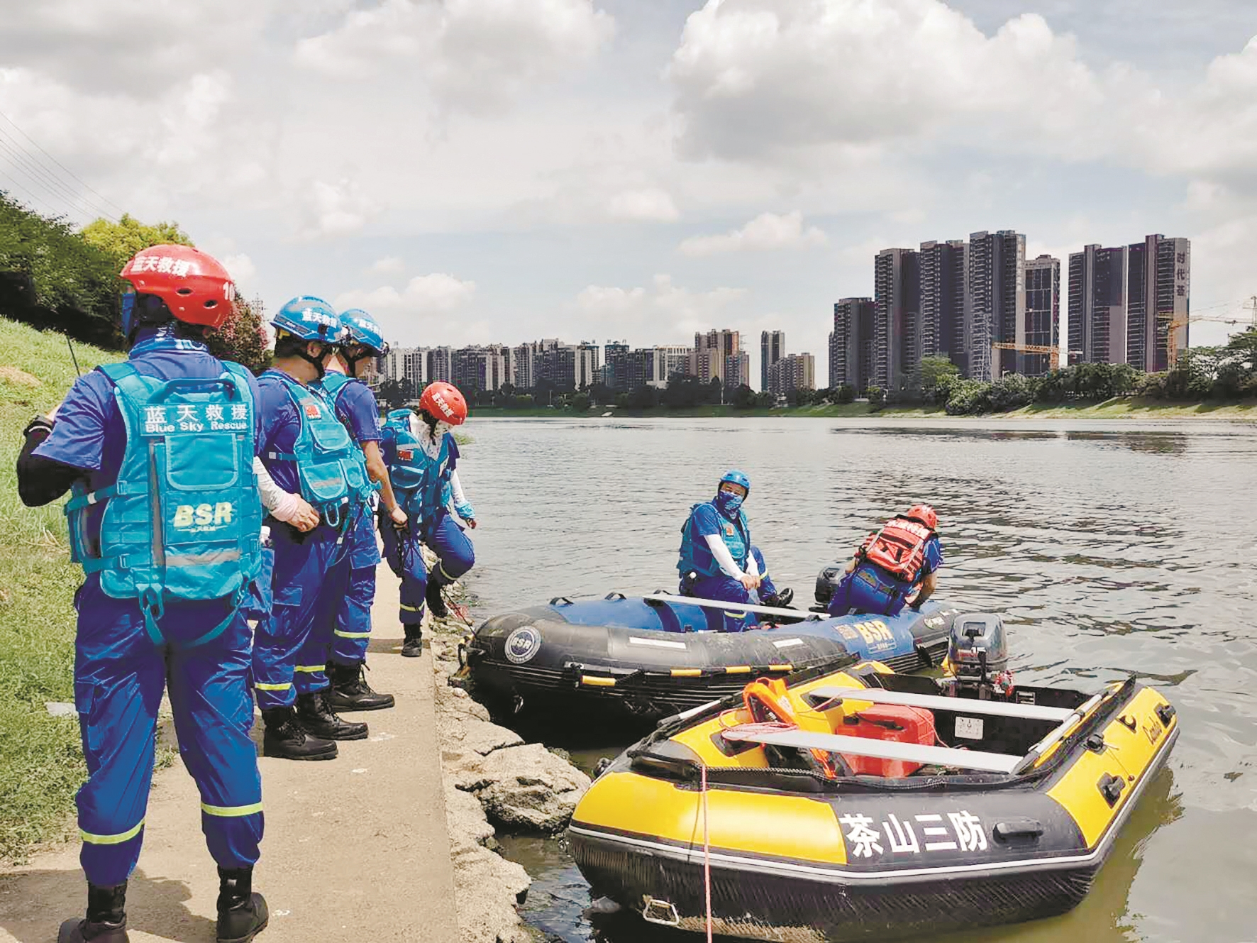 事发后,东莞茶山消防大队救援人员,第一时间在寒溪河水域开展搜救。