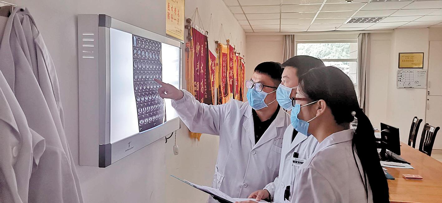 十堰市太和医院专家李昊(左一)与林区人民医院医生看片会诊。