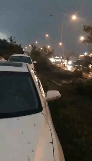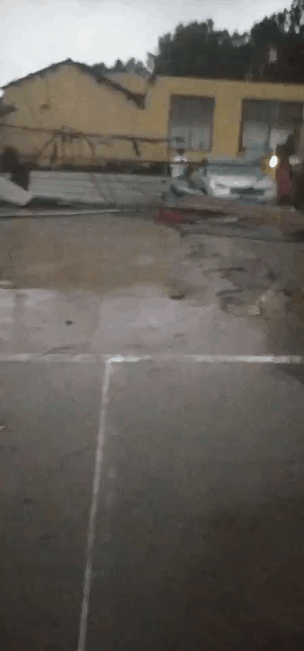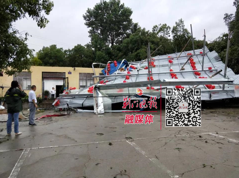 大量工棚受损严重,数十棵行道树连根拔起,工棚吹落的铁皮扭曲变形。
