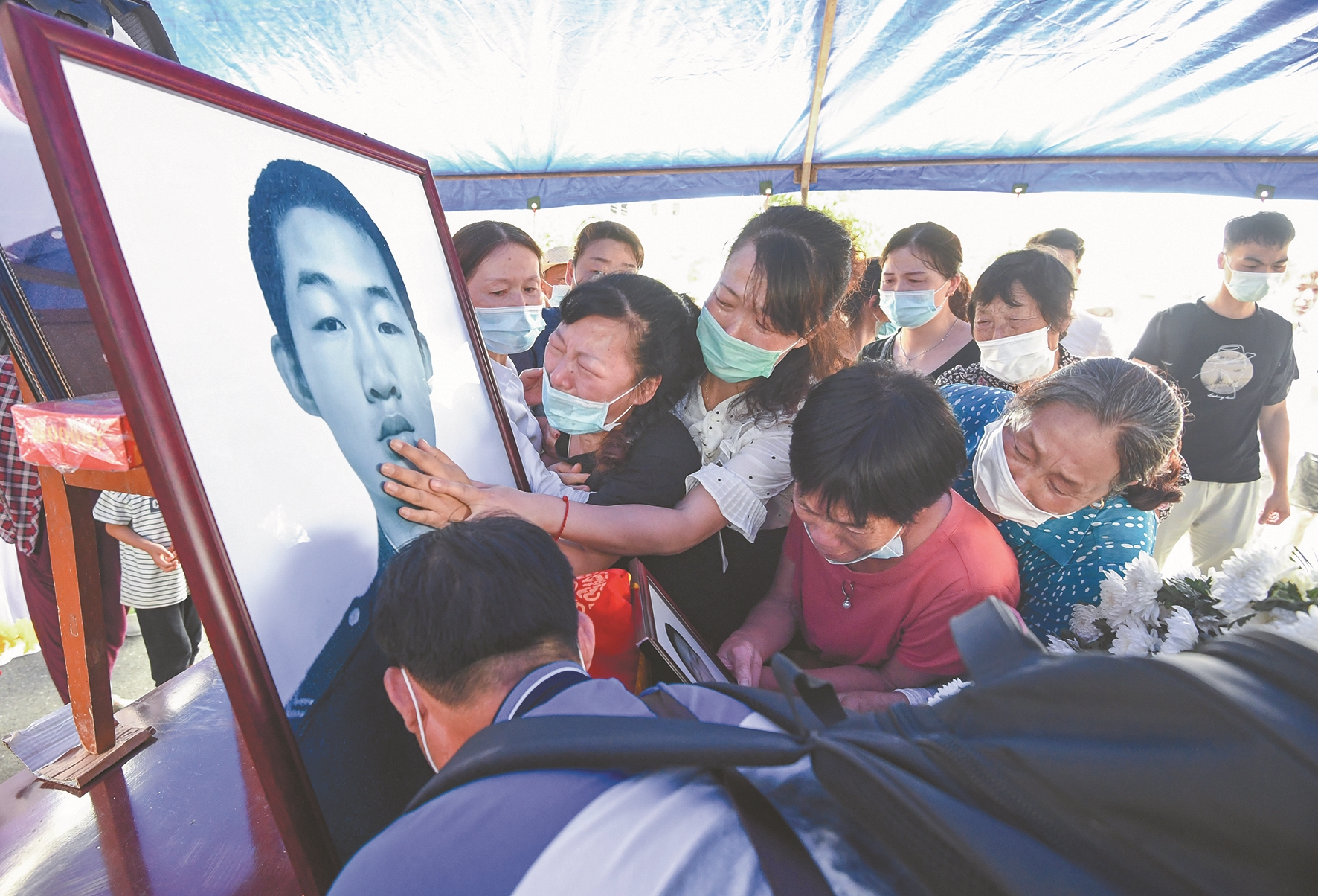 下午1时30分,亲属从灵堂内取出英雄的骨灰,他们将穿过村里一条长约300米的小道,小道尽头的土地上,一处空置的墓穴正静待英雄到来。