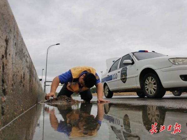 “大桥的这个排水口里面有碎石块,堵塞了管道的三分之二。”周贤松将撬杠伸进排水管,一点点掏出碎石,积水瞬间流进管道口。由于早上7点就出门巡查,已经疏通桥梁排水口17个,体力有些不支,这位身高1米84、体重近200斤的壮汉,干脆跪在水里,放下撬杠,用手掏出管底积存的淤泥。