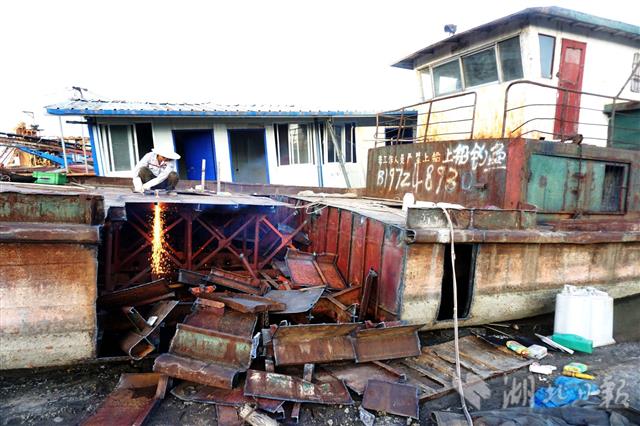 6月29日,十堰市郧阳区汉江城关镇段被扣押的筏钓船在岸上被切割。