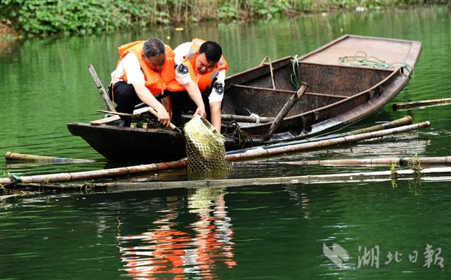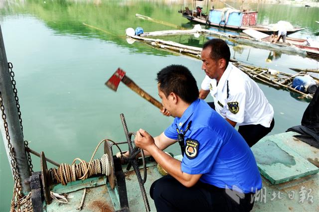 6月28日,十堰市郧阳区联合执法人员正在辖区汉江中段清除筏钓船固定钢丝绳,准备拖走扣押。