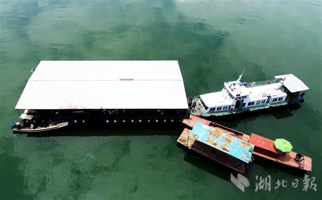 6月29日,十堰市郧阳区联合执法人员在汉江安阳镇段依法扣押筏钓房。