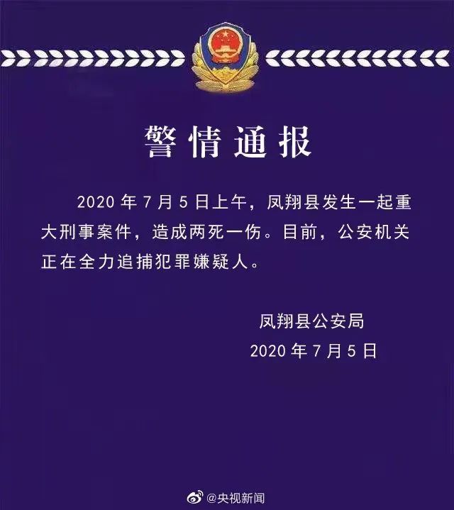7月5日上午,陕西凤翔发生一起重大刑事案件,造成两死一伤。目前,警方正在全力缉捕犯罪嫌疑人。凡能提供线索抓获犯罪嫌疑人的,公安机关将奖励人民币3万元。