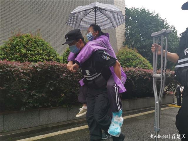 楚天都市报7月7日讯(记者吴昌华 通讯员黄明月)高考开考遇到下雨天,一些特殊考生遇到困难,今晨,一名腿上打着石膏的考生拄拐打伞,行走吃力,执勤特警见状上前相助,把她背进考场。
