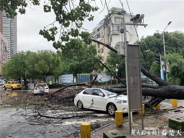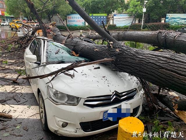 楚天都市报7月7日讯(记者刘闪 实习生张司宇)今天下午1时许,武汉南湖西路与狮子山北路路口停车场内一棵大树突然倒下,砸到停在路边的一辆私家车和一辆出租车,所幸没有造成人员受伤。