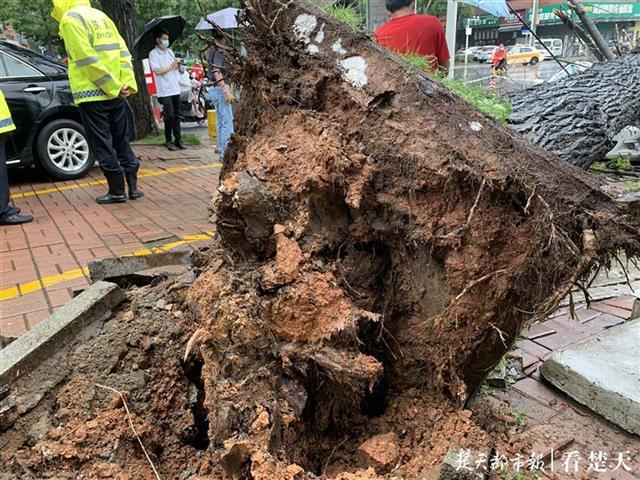 今天下午2时许,楚天都市报记者赶到现场时看到,倾倒的是一棵大杨树,又粗又高,位于南湖山庄半岛花园停车场内,靠近南湖西路与狮子山北路路口。一辆白色雪铁龙轿车被树干压瘪,车头、车顶、挡风玻璃等受损严重。停在路口的一辆出租车也被砸中,后排车顶和车尾被砸破。记者注意到,倾倒的大树较粗,树根和树枝有些干枯,树上树叶明显比周边大树少许多。倾倒后,树枝散落满地,民警已经赶到了现场,四周拉起一道警戒线。