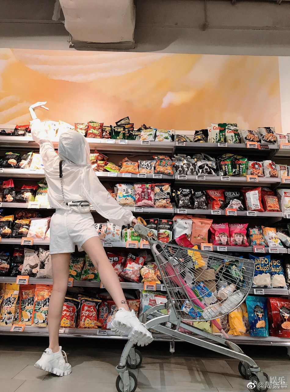 7月7日晚上,周扬青发微博分享去超市的照片,她穿白色套装摆各种pose超开心,姿势搞怪一双长腿十分抢镜,并喊话为高考学生加油。