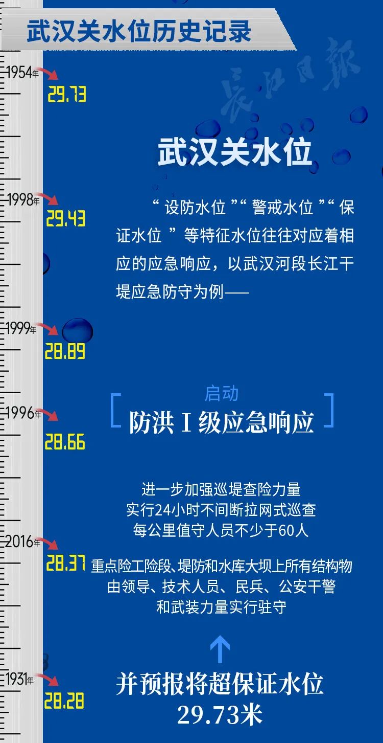 《武汉市城市防洪应急预案总体预案》显示,长江武汉关站历年最高水位超过27.00米,此前按照由高到低排列前十的水位分别是:
