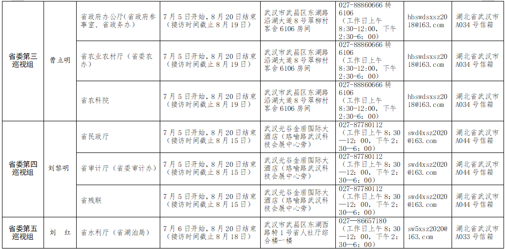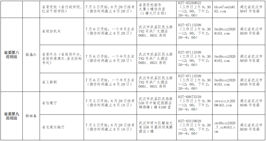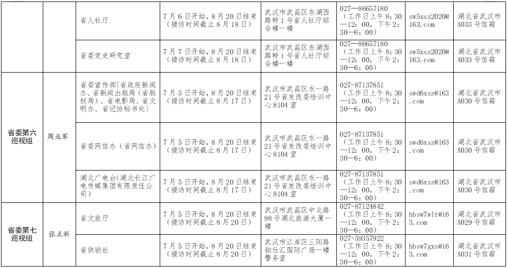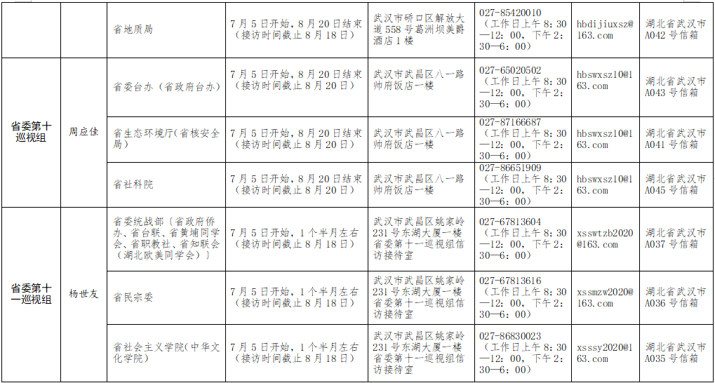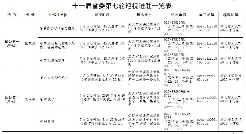 十一届省委第七轮巡视着重对省委办公厅(省档案局)、省人大常委会机关、省政府办公厅(省政府参事室、省政务办)、省政协机关、省委政研室(省委改革办、省委财经办)、省委机要保密局、省财政厅、省档案馆、省农业农村厅(省委农办)、省农科院、省审计厅(省委审计办)、省残联、省人社厅、省委党史研究室、省委宣传部〔省政府新闻办、省新闻出版局(省版权局)、省电影局、省文明办、省记协秘书处〕、省委网信办(省网信办)、湖北广电台(湖北长江广电传媒集团有限责任公司)、省文旅厅、省供销社、省委党校(省行政学院、红安干部学院)、省委外办(省政府外办、省政府港澳办、省友协秘书处)、省工商联、省住建厅、省交通运输厅、省地质局、省委台办(省政府台办)、省生态环境厅(省核安全局)、省社科院、省委统战部〔省政府侨办、省台联、省黄埔同学会、省职教社、省知联会(湖北欧美同学会)〕、省民宗委、省社会主义学院(中华文化学院)等31家省直单位开展常规巡视,同步开展选人用人、保密工作专项检查,同时以省市县三级联动方式对省民政、水利2个部门开展专项巡视巡察。