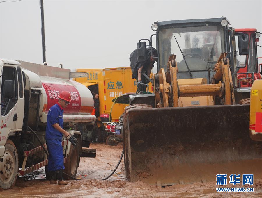 作业间隙,李群群(右)冒着大雨给装载机加油(7月10日摄)。 新华社记者 周密 摄