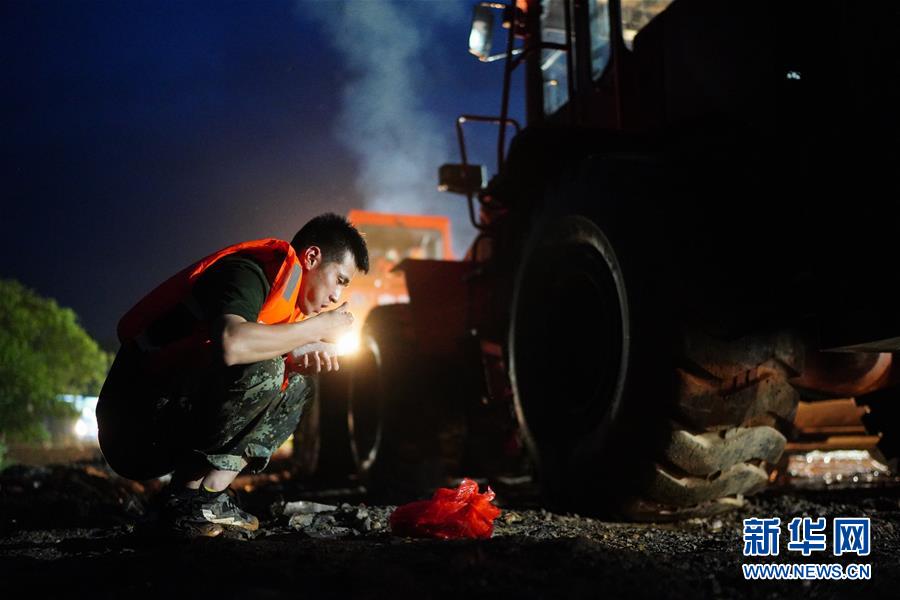 1993年出生的装载机操作手李群群已经在江西省鄱阳县问桂道圩堤决口处连续工作了12小时,被问到累不累时,他腼腆地回答:“没什么的,战友们都是这样的。”
