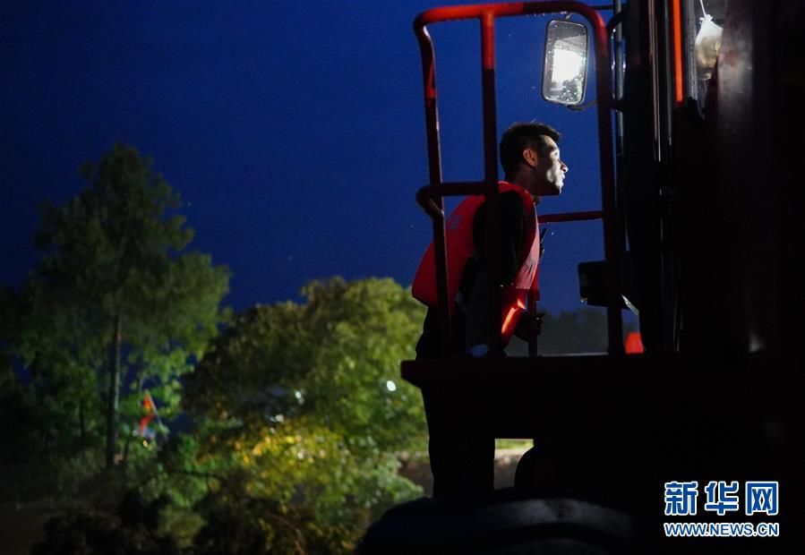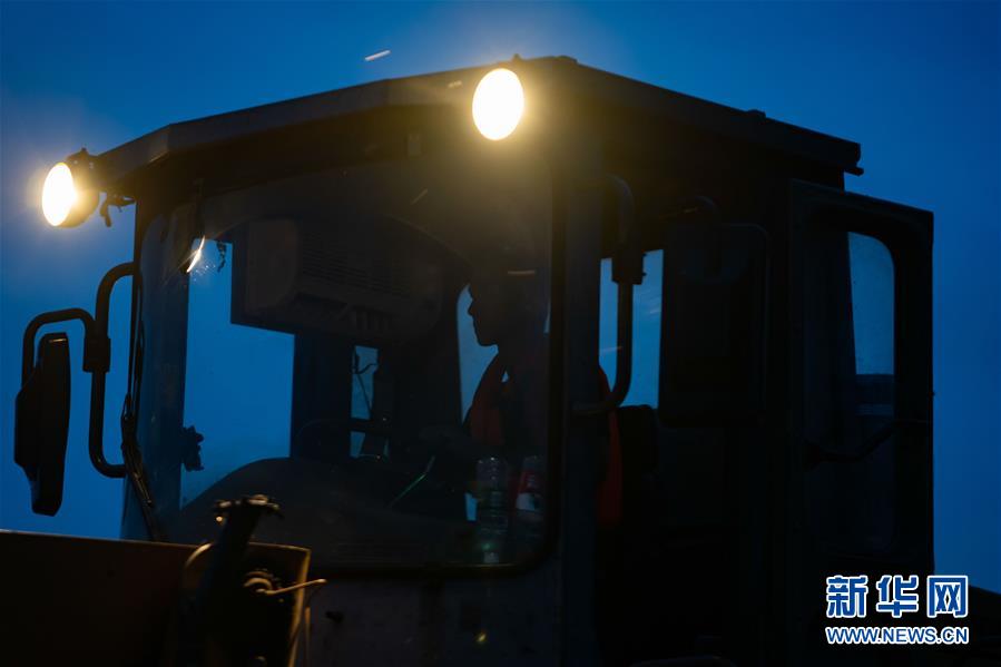 天色渐晚,李群群还在全神贯注地作业,此时距离他登上装载机已过去11个小时(7月10日摄)。新华社记者 周密 摄