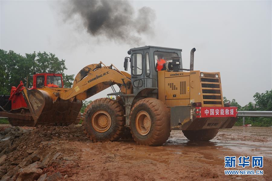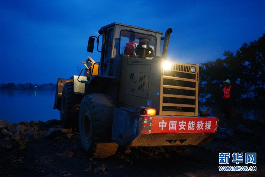 李群群驾驶装载机在决口处作业(7月10日摄)。 新华社记者 周密 摄