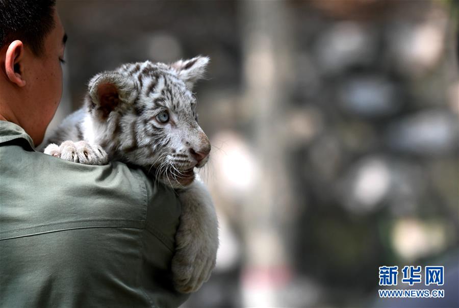 7月13日,工作人员将“妞妞”带回饲养室。 河北石家庄市动物园的孟加拉白虎宝宝“妞妞”只有3个月大,由于虎妈妈经验不足,“妞妞”一出生便由动物园工作人员按科学方法人工饲养。目前,在饲养员的精心照料下,“妞妞”正在茁壮成长。 新华社记者 王晓 摄