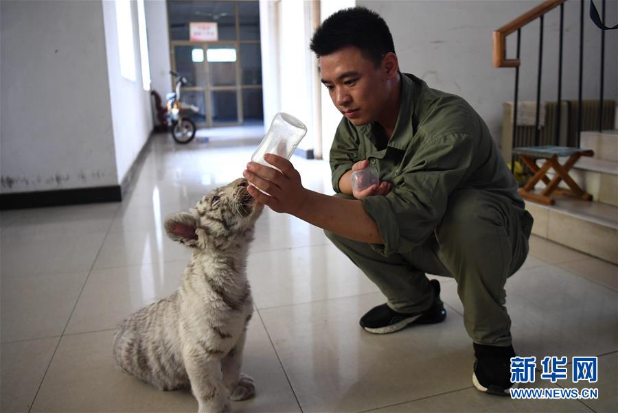 7月13日,动物园工作人员许家兴给“妞妞”喂水。 河北石家庄市动物园的孟加拉白虎宝宝“妞妞”只有3个月大,由于虎妈妈经验不足,“妞妞”一出生便由动物园工作人员按科学方法人工饲养。目前,在饲养员的精心照料下,“妞妞”正在茁壮成长。 新华社记者 王晓 摄