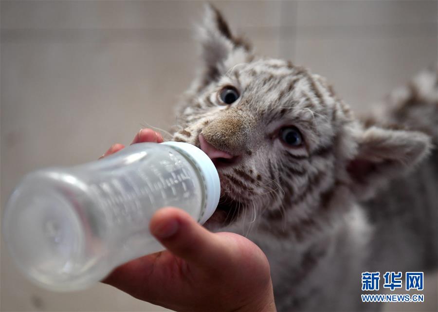 7月13日,工作人员给“妞妞”喂水。 河北石家庄市动物园的孟加拉白虎宝宝“妞妞”只有3个月大,由于虎妈妈经验不足,“妞妞”一出生便由动物园工作人员按科学方法人工饲养。目前,在饲养员的精心照料下,“妞妞”正在茁壮成长。 新华社记者 王晓 摄