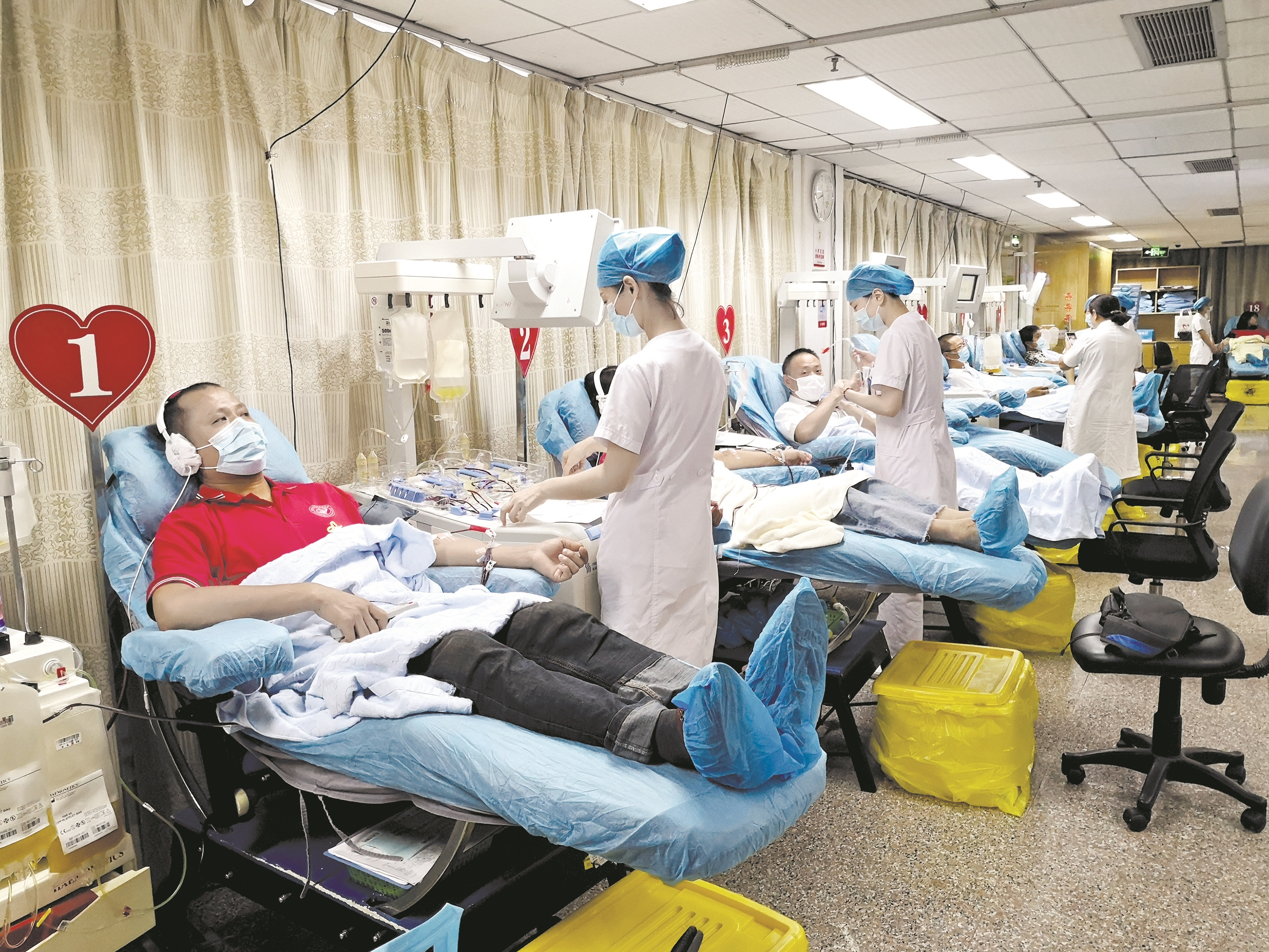 早上7时30分许,来自黑龙江大庆的韩庆东就已经坐上了采血椅。为了来武汉献血,他7月10日凌晨就出发了,先坐火车再转飞机。作为大庆市无偿献血志愿服务队的一员,韩庆东从2002年开始献血,目前已经累计献血151次,“很早就听说武汉的成分献血服务全国最棒,正好趁这次来体验一下!”一边献血,他一边把自己献血的照片发到朋友圈,并写道:“我们用行动向大家证明,武汉是安全的,武汉欢迎您!”