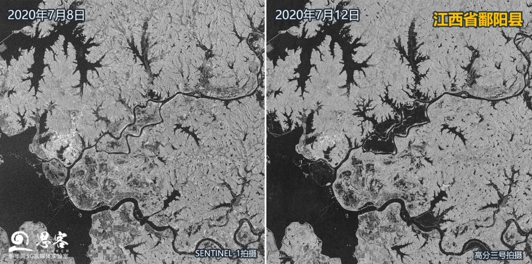 ▲图为鄱阳县7月8日与7月12日对比图。卫星数据来源:SENTINEL-1、高分三号