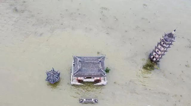 2020年7月11日航拍的淹没在水中的鄱阳湖落星墩,来源:中国天气网