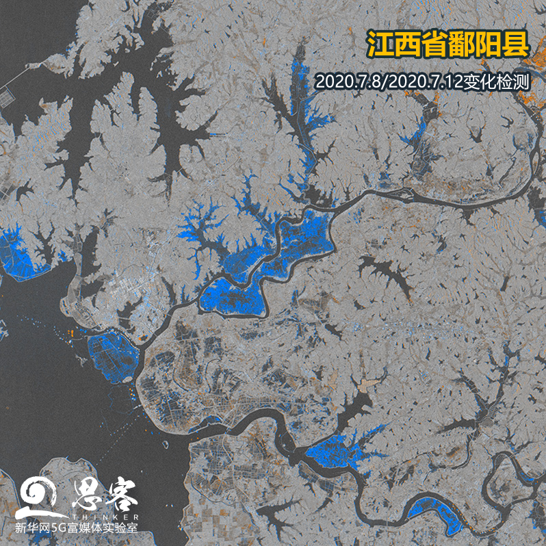 通过最新的雷达卫星影像分析,鄱阳县受灾情况一目了然。检测图中,蓝色区域的是新被水淹没的区域,而橙色是水退陆地露出的区域。