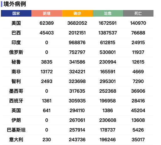 人民网北京7月17日电 综合消息,过去24小时,全球新冠疫情要点如下:中国以外新冠确诊病例达13293156例。美国新冠感染病例超过355万,新增超7.8万。伊拉克将进一步放松防疫措施。爱尔兰推迟实施第四阶段解禁计划。韩地方政府要求美军赴韩前做病毒检测。东京都单日新增新冠病例数创新高。法国政府采取措施应对疫情反弹。英国已有近65万人因疫情失业。