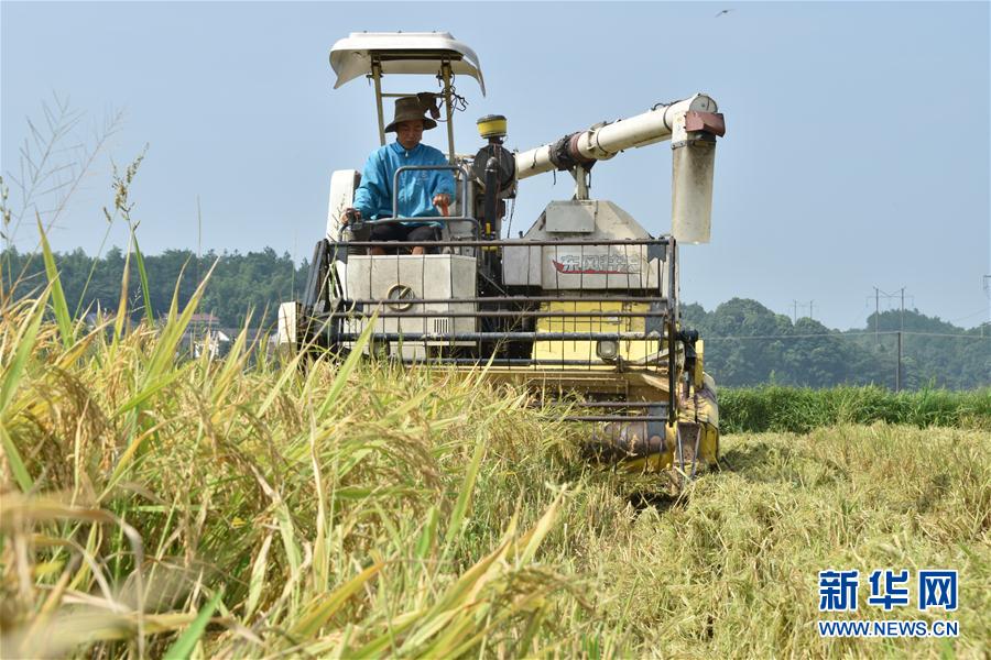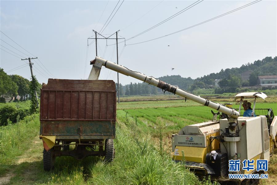7月15日,在湖南衡东县洣水镇采霞村,机手驾驶收割机将稻谷输送到运粮车上。 新华社记者 白田田 摄