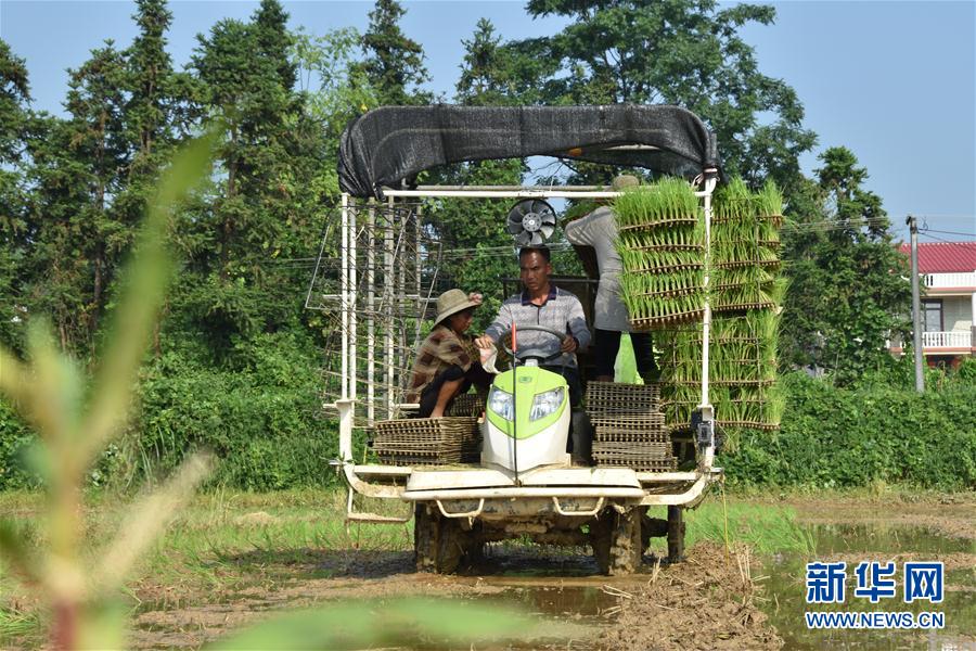 7月15日,在湖南衡东县洣水镇采霞村,农机专业合作社的机手驾驶新型抛秧机抢种晚稻。 新华社记者 白田田 摄