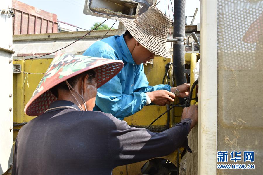 7月15日,在湖南衡东县洣水镇采霞村,村民康文俊(右)和父亲一起维修收割机。 新华社记者 白田田 摄