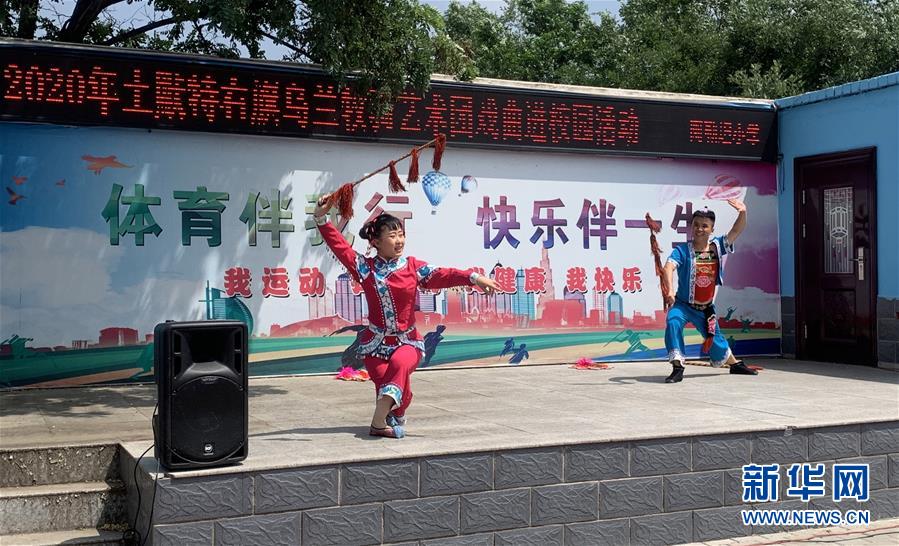包头市土默特右旗乌兰牧骑二人台艺术团的演员在土默特右旗阿勒坦小学表演二人台(7月9日摄)。新华社记者 朱文哲 摄