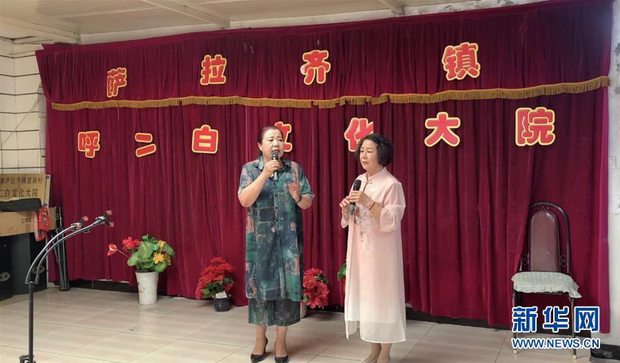 包头市土默特右旗萨拉齐镇建新村的村民在建新村呼二白文化大院表演二人台(7月9日摄)。新华社记者 朱文哲 摄