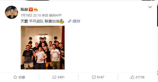陈赫在绿洲晒出与电子竞技战队天霸队成员的合影,并祝战队联赛加油,他写道:“天霸,千斤战队,联赛加油。”照片中,陈赫站在成员们的身后,与成员们一起合影留念。