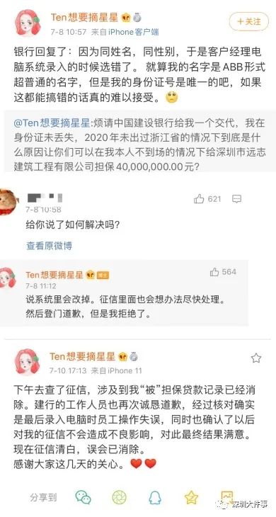日前,浙江市民陈小姐(微博名“Ten想要摘星星”)喊话远在深圳的建行称,因买房需要个人征信报告,她前往中国人民银行查询征信。结果吓一跳,这名网友名下竟然莫名多了4000万的贷款担保,而且来自深圳。