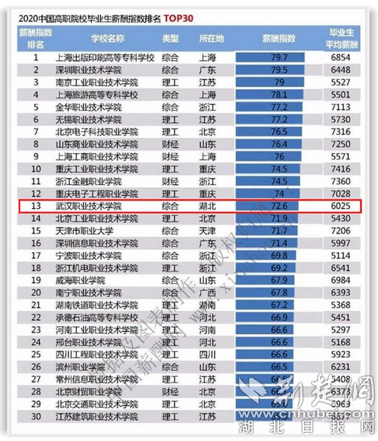荆楚网客户端—荆楚网消息(记者许文秀 通讯员陈峰)7月21日,记者从武汉职业技术学院获悉,该校上榜中国薪酬指数研究机构近日发布的《2020中国高职院校毕业生薪酬指数排名》。学校荣登TOP30,位列全国第13位,系湖北省内高职第一,薪酬指数为72.6,毕业生平均薪酬6025元。