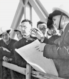 唐寰澄(左三)与苏联专家在武汉长江大桥上。