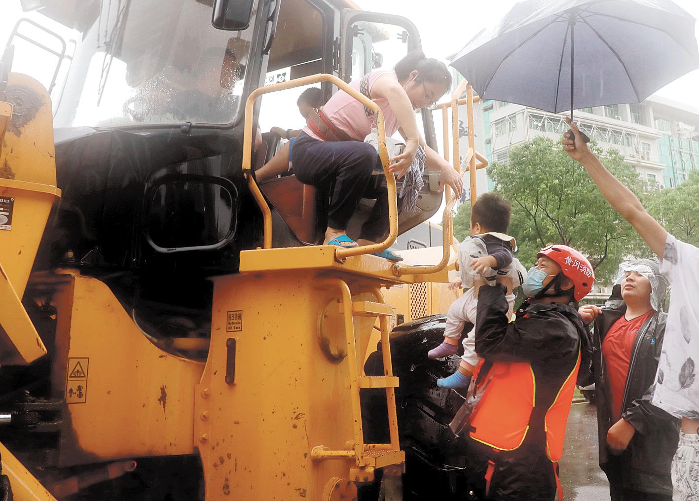 黄飞(图中抱举小孩者)在内涝区域转移营救被困群众。 (通讯员 徐普查 摄)