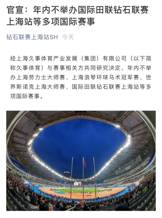 中新网7月24日电 24日,国际田联钻石联赛上海站官方发布公告,今年的赛事取消。此外在公告中还介绍,经上海久事体育与赛事相关方共同研究决定,年内不举办上海网球大师赛、上海浪琴环球马术冠军赛、世界斯诺克上海大师赛等多项国际赛事。