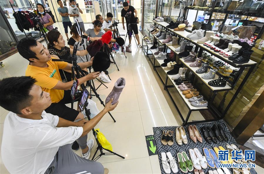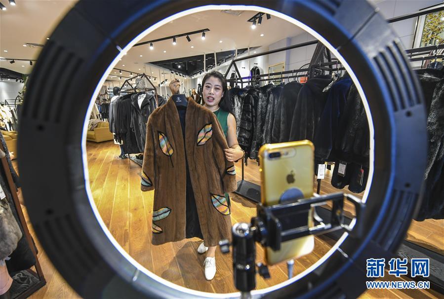 7月24日,枣强县一家皮草商城的主播利用直播平台推介裘皮服装。 裘皮产业是河北省枣强县的特色传统产业,今年以来,该县积极引导裘皮商户通过线上直播的方式销售产品,为当地带来良好的经济效益。 新华社记者 李晓果 摄